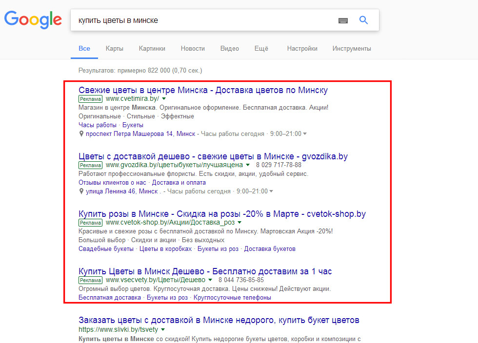 - При вводе пользователем одного из выбранным запросов в результатах поиска появляется ваше объявление со ссылкой на Ваш сайт